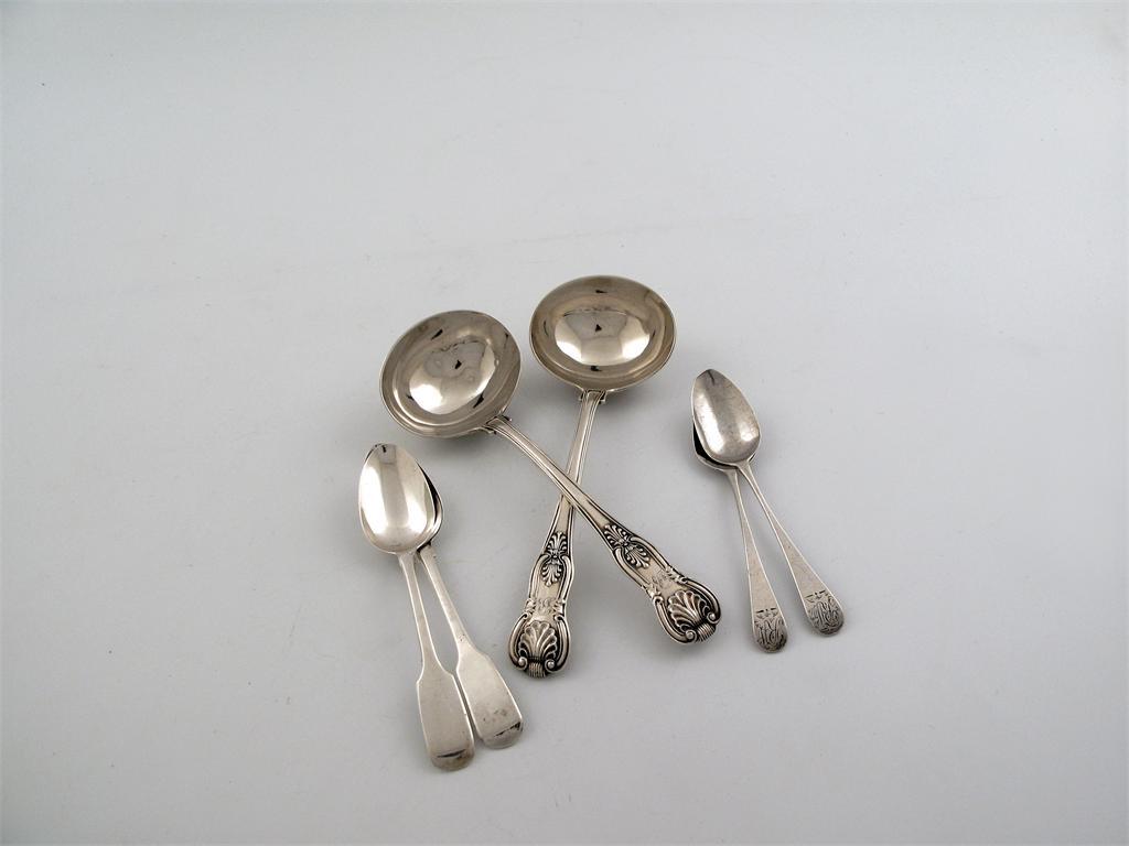 Paul Storr. A pair of kings pattern sauce ladles, engraved 'IB' London 1817 also a pair of fiddle patterntea spoons by Hayne and Cator, London 1845 and a pair of old English pattern tea spoons by Peter and William Boatman London 1813, 6ozs (6).
