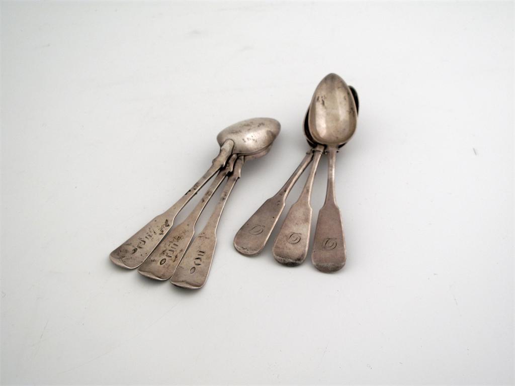 A set of six interesting Scottish provincial fiddle teaspoons, initialled 'D', with psuedo marks, some deface and one with a small incuse 'rose mark', by repute from the Gladstone family, Fethercairn, Angus, unascribed, early 19th century, 6oz. (6)