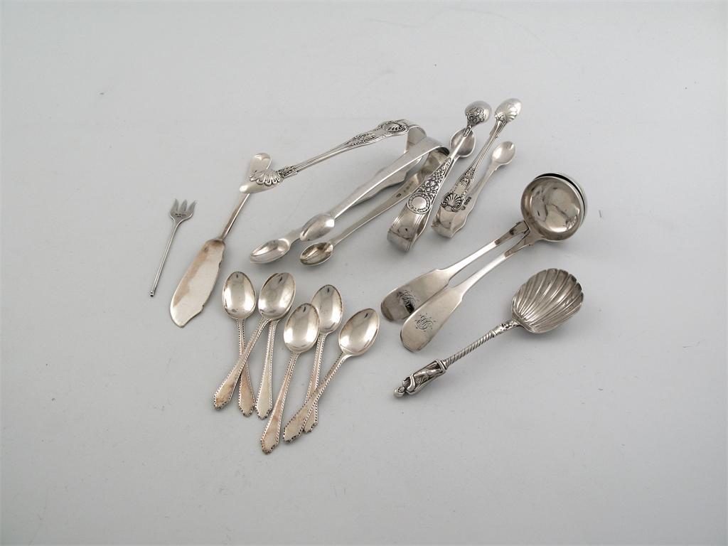 Mixed cutlery: a pair of toddy ladles, 'J B', by William Cunningham, Edinburgh 1833, a pair of Kings pattern sugar tongs by W.R. Smily, London 1849, three other pairs, six coffee spoons, a shell bowl preserve spoon, London 1878 and a butter knife, 10oz (14)