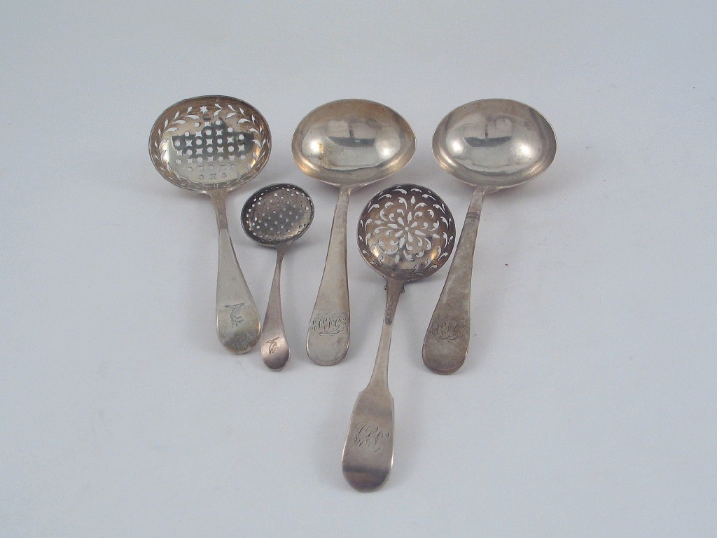 Five assorted ladles: a pair of Old English sauce ladles by Solomon Hougham, London 1804, a William IV sugar sifter ladle crested, London 1832, a condiment ladle crested, London 1803 and a Scottish toddy ladle with a pierced bowl, 6oz. (5)