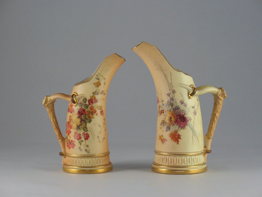 Two Royal Worcester tusk jugs, decorated with flowers, c. 1895 and 1900, 20.5cm. Max. (2)