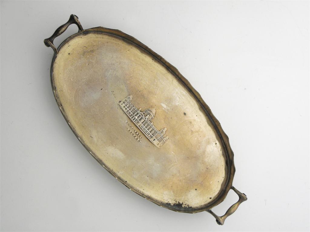 An Edwardian miniature, two-handled oval tray with a wavy rim stamped in the centre with the "City Hall, Belfast" by T. Bradbury & Sons, Sheffield 1903, 6in (15.1cm) long, 2.5oz