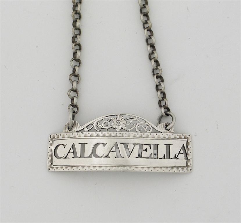 A George III oblong wine label, pierced 'CALCAVELLA', bright cut border with a fret scroll and flowerhead surmount, by Samuel Meriton, London 1775, makers mark and lion passant marks only.