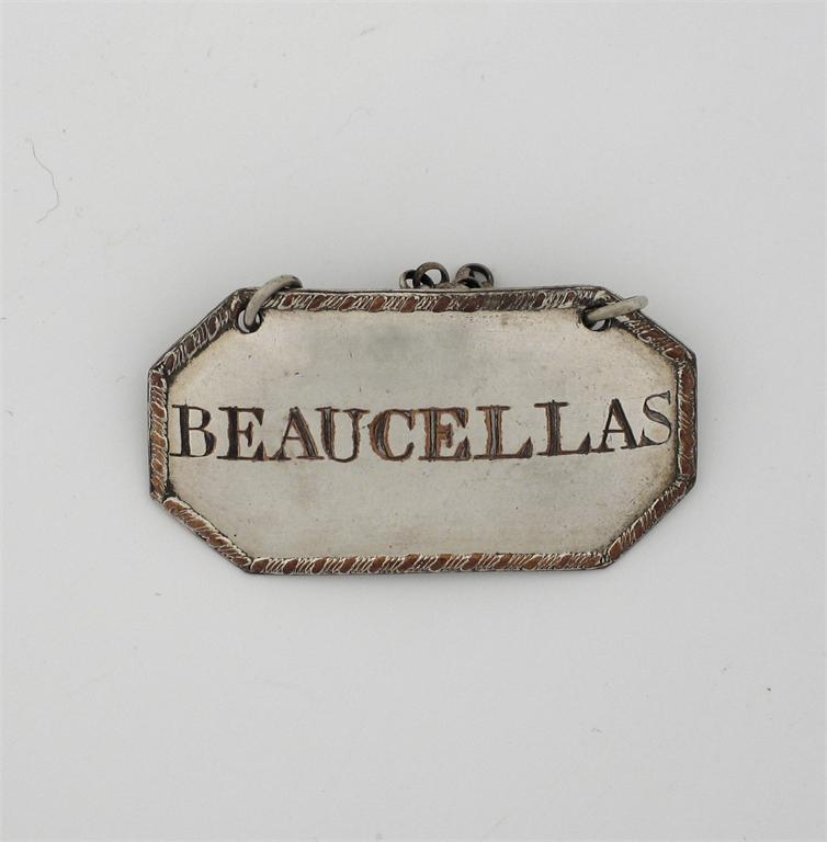 A George IV Sheffield plate, canted oblong wine label, incised 'BEAUCELLAS', with gadrooned border.