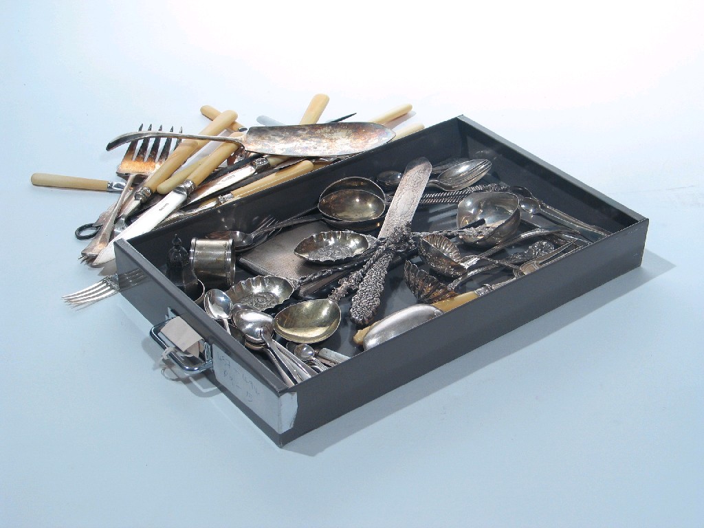 A mixed lot comprising: a pair of fish servers, a paperknife, four continental spoons, a pair of eastern spoons, an apostle spoon, three sifter ladles and mixed teaspoons, condiment spoons, tongs plated and other items. (A Lot).
