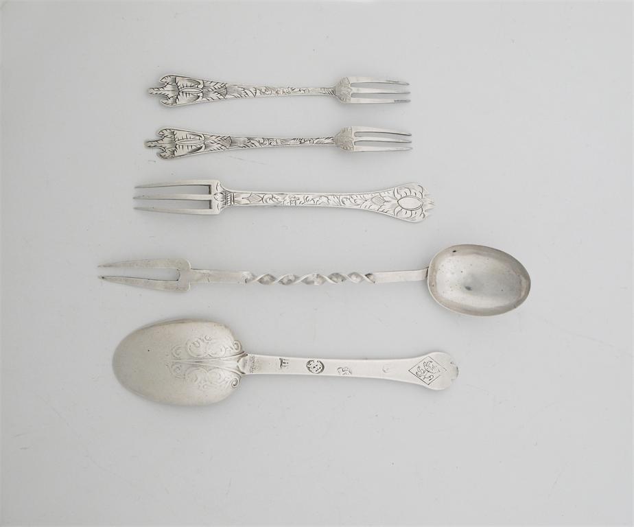A pair of late 17th century small engraved trefid sweet meat forks, maker's mark only, D S crowned (?) circa 1690, 3.75in (9.5cm)