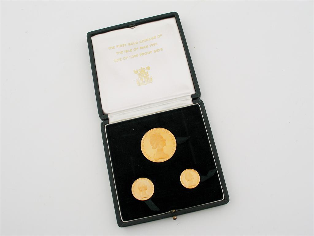 Isle of Man, Elizabeth II, Proof Set of Gold Coins, 1965, comprising Five-Pounds, Sovereign and Half-Sovereign, in Royal Mint case of issue. Brilliant mint state, (3)