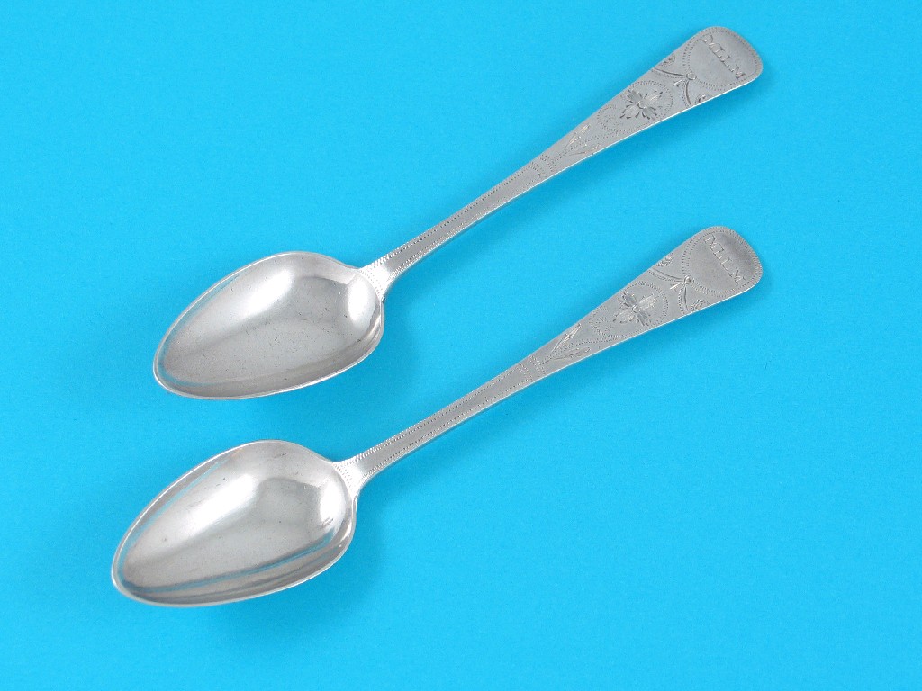 A pair of bright-engraved Channel Isles teaspoons with skeletal drops, initialled "MLLM", by Thomas de Gruchy and John Le Gallais Jersey c.1835, 0.8oz. (2)