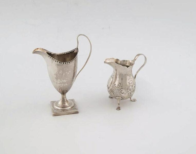 A George III helmet cream jug, makers mark of George Gray partially overstriking that of Hester Bateman, London 1788, and a George Tiembossed cream jug, 5oz. (2)