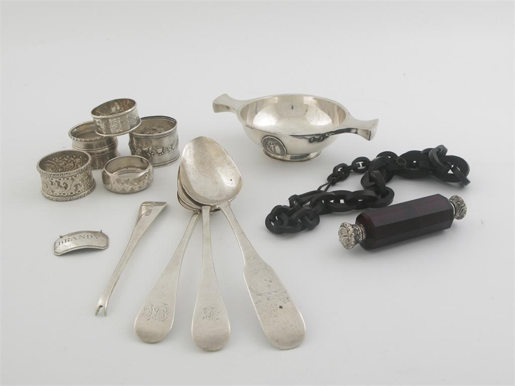 A mixed lot: a George III "BRANDY" wine label, 5 various napkin rings, a mounted red glass scent bottle, three tablespoons (one Irish), a pigs blood neck chain, a nut pick and a Quaish with the applied badge of the "Edinburgh and district Motor Club LTD", 12.5oz weighable silver (13)