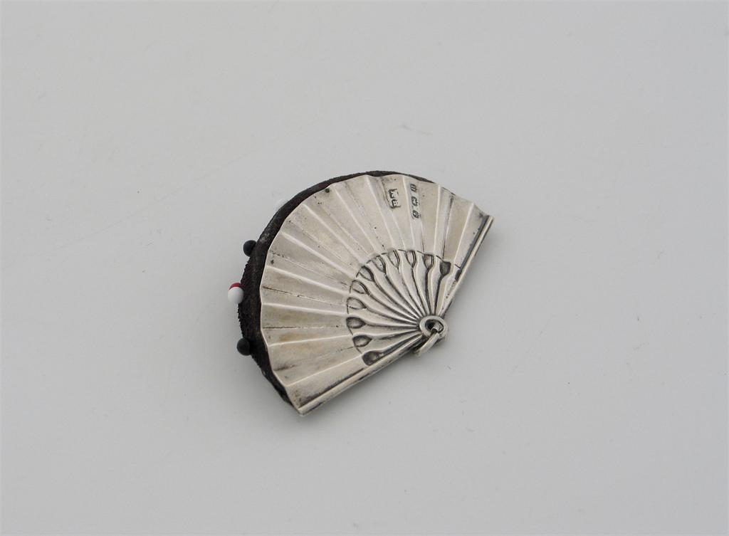 A modern pin cushion, in the form of an open fan, with suspension loop, by Henry Matthews, Birmingham 1912, 2.5in (6cm) wide.