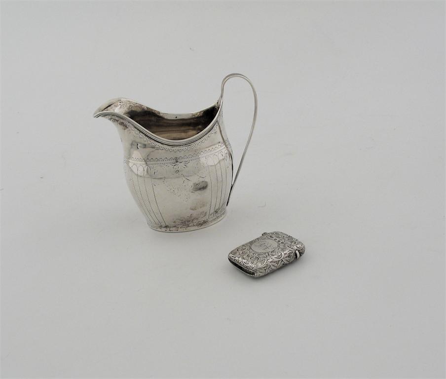 A George III engraved cream jug, makers mark worn, London 1800 and a late Victorian engraved vesta case, Birmingham 1899, 4oz. (2)