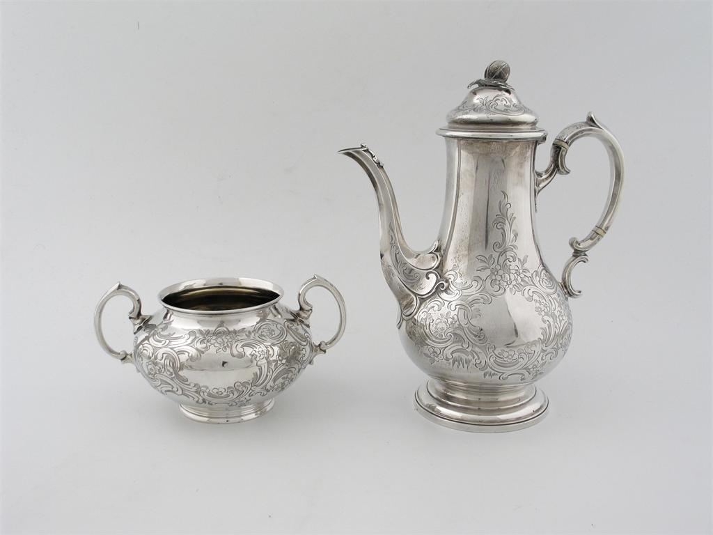 A Victorian three-piece tea service, of bulbous form with foliate engraving, the teapot with melon finial, by William Hunter, London 1858 together with a matching vase shaped coffee pot, by Edward & John Barnard, London 1855, 66oz. (4)