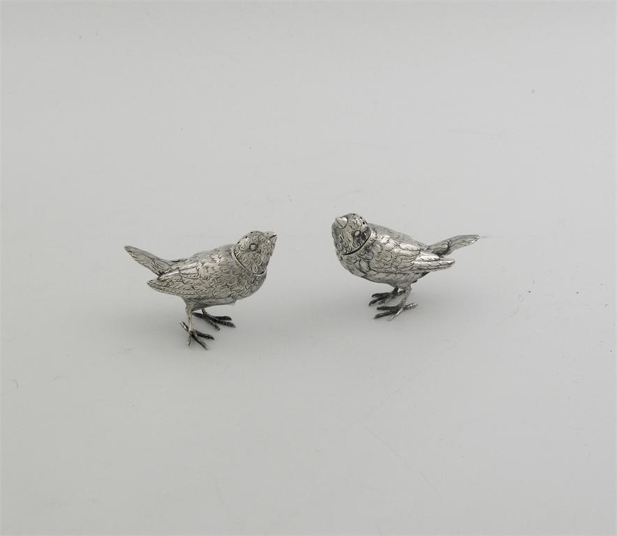 A pair of novelty peppers in the form of finches, import marks for London 1925, 2in (5.1cm) high, 4oz (2)