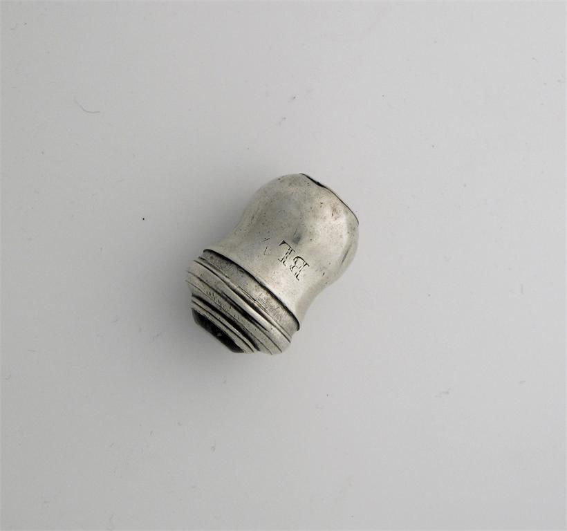 A George II small upright snuff mull, waisted the hinged cover inset with a coloured agate boss, the base initialled 'GP', the front initialled 'BL', unmarked, probably Scottish, c.1740, 1.55in (4cm) high.