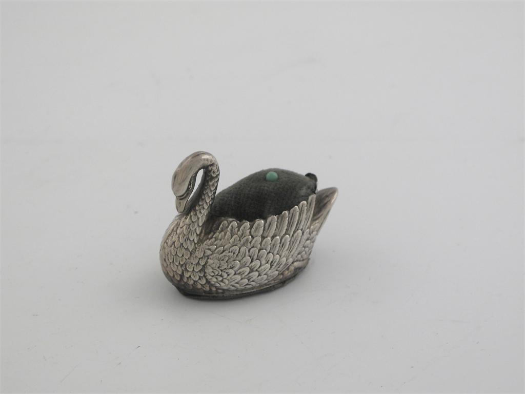A pin cushion in the form of a swan, by H. Matthews, Birmingham 1908, 2.2in (5.4cm)