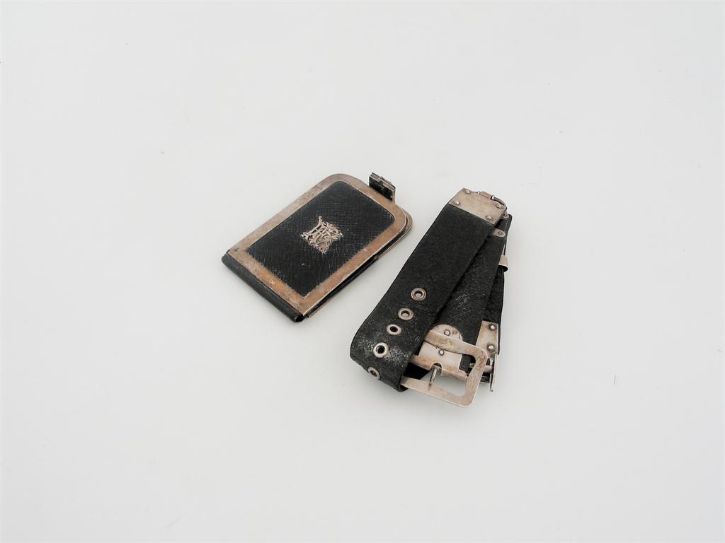 A Victorian mounted leather belt, with applied monogram, by H.W.Dee, London 1870, and a Victorian mounted leather wallet monogram, makers mark 'HK', London 1867, the belt 28in (71.2cm) long. (2)