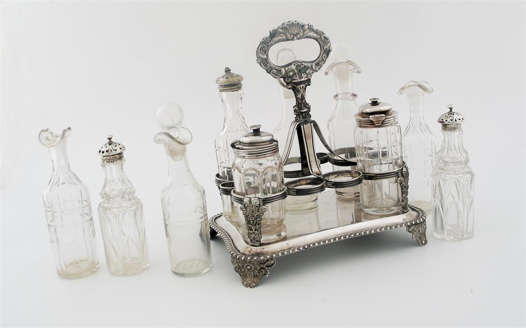 A William IV gadrooned oblong cruet frame, with a foliate ring handle and ornate feet, by John Evans, London 1836, together with 10 matching cut glass bottles (four of them with silver mounts and one with a plated mount, only two of the mounts original), the frame 9.5in (24cm) high, 22oz.