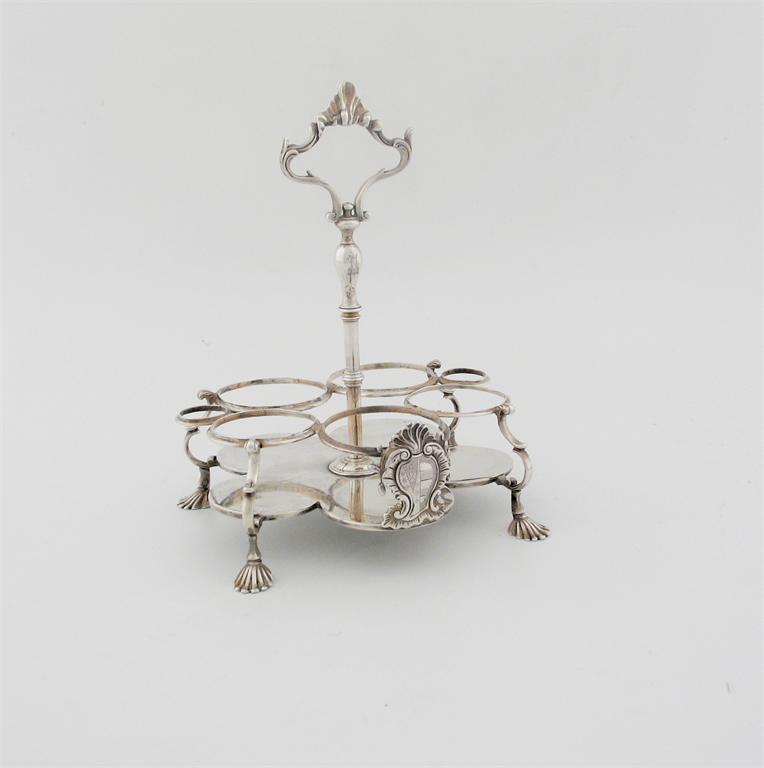 A George II Warwick cruet frame, stem handle and a rocaille cartouche with an engraved coat of arms, by Samuel Wood, London 1759, 9in (23cm) high, 22.5oz.