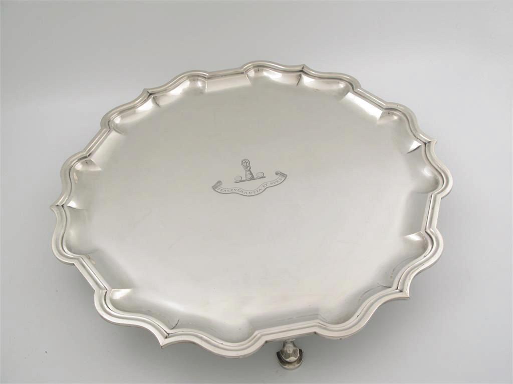 A large modern salver, with a pie crust border and four large horseshoe feet, crest and motto "PERSEVERANTIA.ET.SPES" crest and motto of Branston in centre, by Charles Stuart Harris & Sons, London 1912, 18.25in (46.2cm), 82oz.