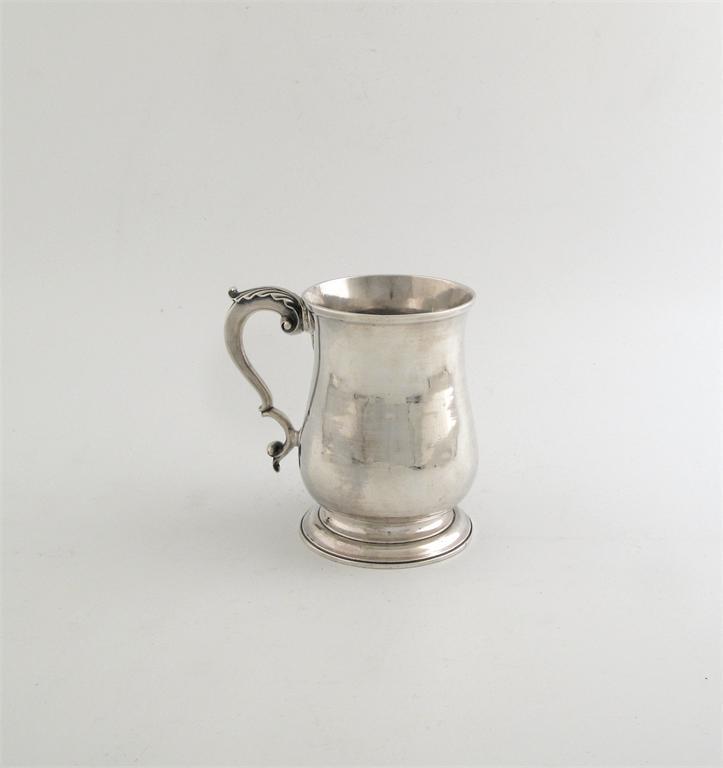 An early George III baluster pint mug with spread foot and leaf-capped double scroll handle, engraved I over P A, by Thomas Whipham and Charles Wright, London 1765, 5in (12.7cm) 13oz