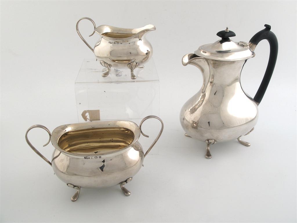 A George V five piece tea service, plain, of bulbous oval form, on pad feet, the kettle with stand and spirit lamp, by J. Gloster Ltd, Birmingham 1921, 108oz all in (5)