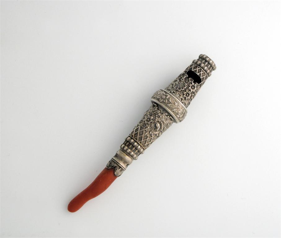 A George III child's teether and whistle with a coral end, suspensory ring and stamped floral decoration, by Joseph Taylor, Birmingham 1823, 4.3in (11cm) long