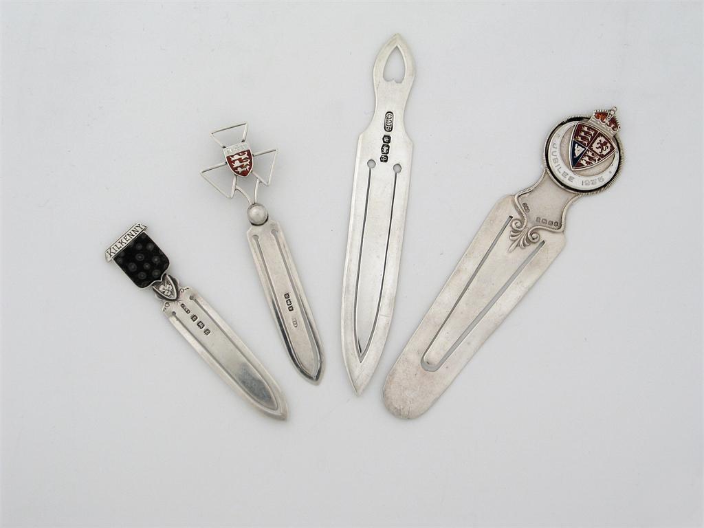 Four bookmarks, a 'Jersey' souvenir example with enamel, Birmingham 1925, a 'Kilkenny' souvenir example, Birmingham 1905, a King George V jubilee example with enamelled terminal, Bimringham 1934 and another with a pierced heart shaped terminal, Sheffield 1933. (4)