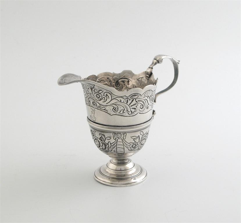 A George II Irish helmet cream jug, chased with bands of floral swags and scrolls on a matt ground, crested, Dublin circa 1745, 4.5in (11.5cm) 5oz