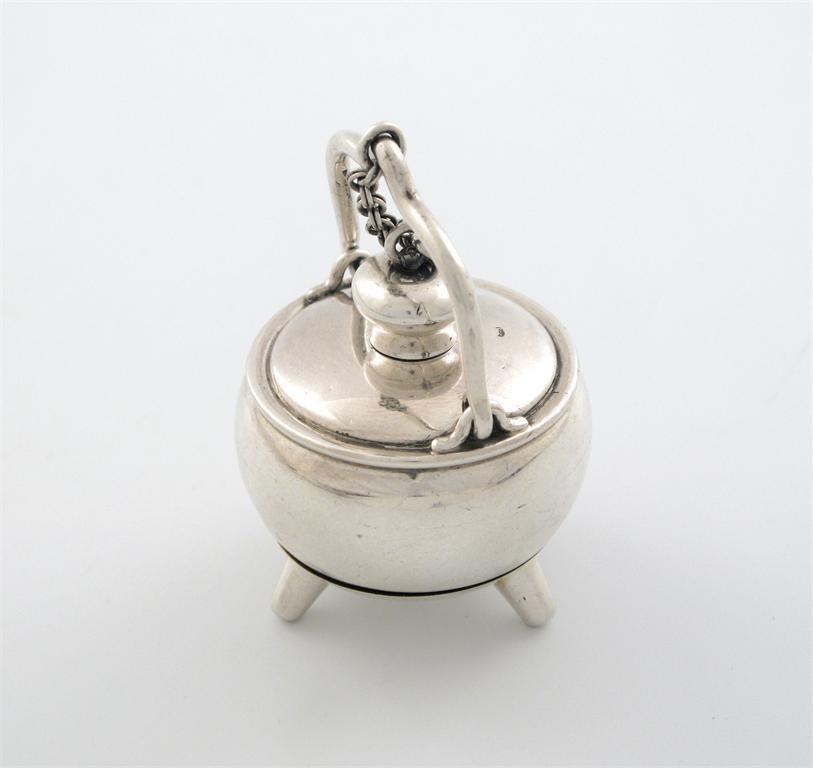 A Victorian novelty vinaigrette and scent bottle in the form of a cauldron with swing handle, screw cap and hinged base, gilt interior, by Jane Brownett, London 1872, 1.55in (4cm)