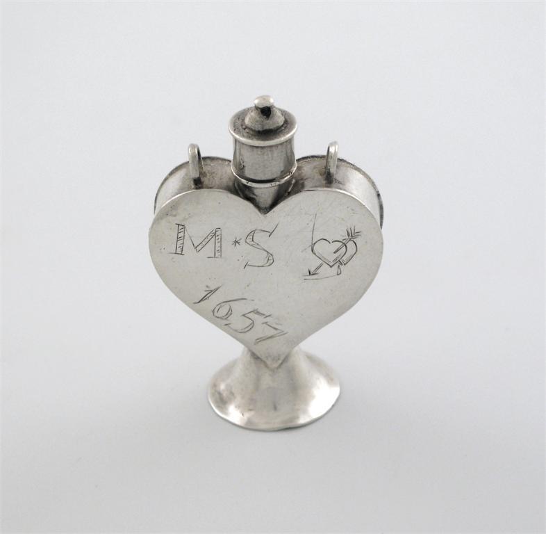 A rare Commonwealth small scent flask, heart-shaped with a pull-off cap and trumpet foot, scratched with the initials "M B", conjoined hearts and "1657", maker's mark only, struck thrice, "I C" with a pellet above a mullet between 1.85in (4.8cm)