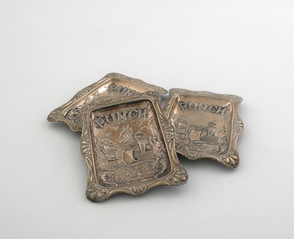 A set of three late Victorian novelty pin trays stamped in relief with the cover of "PUNCH" magazine by Leech Brothers, Birmingham 1894, 4in (10cm) high, 4oz (3)