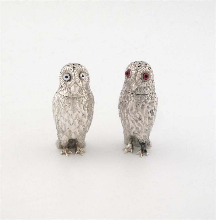 Two similar Victorian novelty owl condiments, with pull-off heads and textured plumage (one with red glass eyes and one with white), by George Urite, Birmingham 1867/68, 3.5in (9cm) high, 5oz. (2)