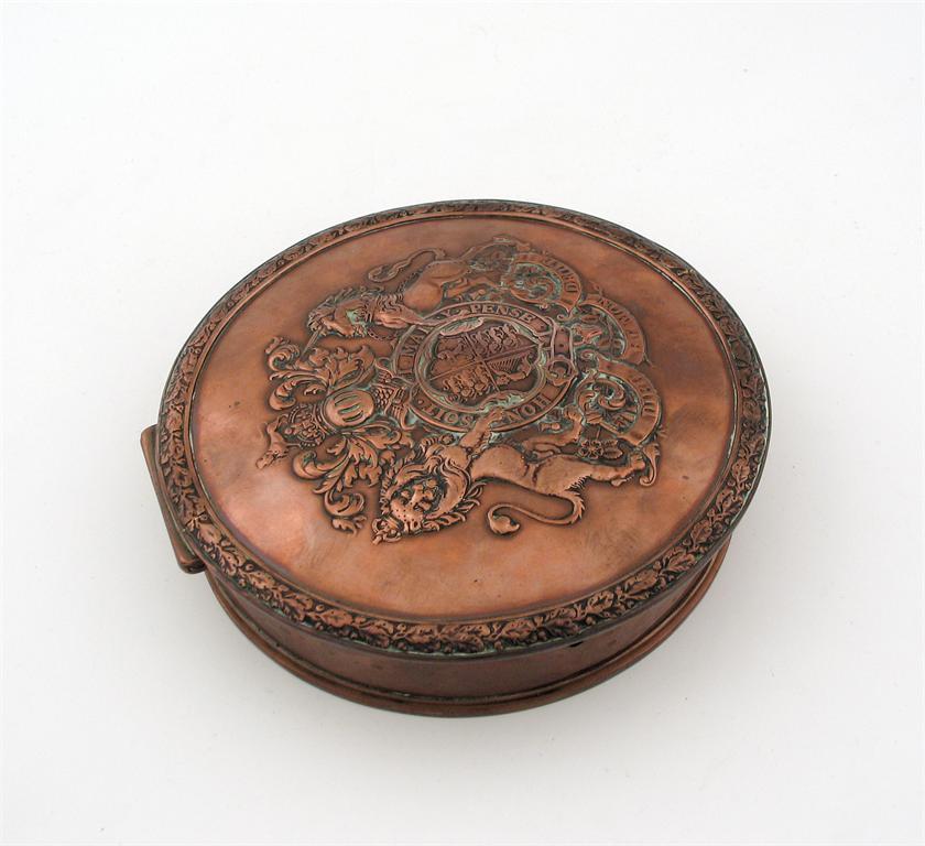 A Victorian copper Royal seal box, shallow circular with a hinged cover, stamped in relief with the Royal coat of arms, with an acorn and oak leaf border, by 'Garrard & Co, Albermale St, London, W', 7.3in (18.5cm) diameter.