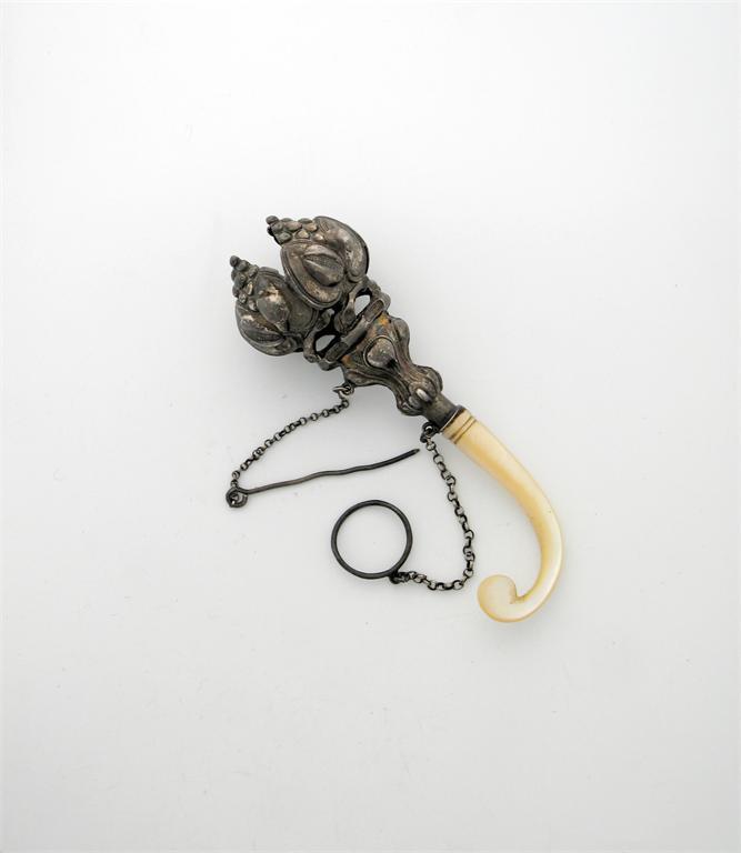 A late 19th century Swedish posy holder with a curved mother of pearl handle