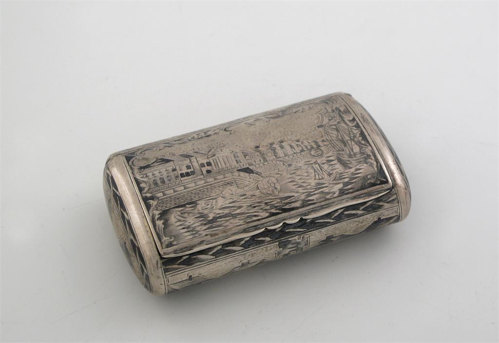 An early 19th century Russian niellwork snuff box, of rounded oblong form with a riverscape on the base and cover, (perhaps the banks of Neva, St Petersburg), makers mark of Alexei Sokolov, Moscow 1827, 3.5in (9cm) long, 3.5oz.
