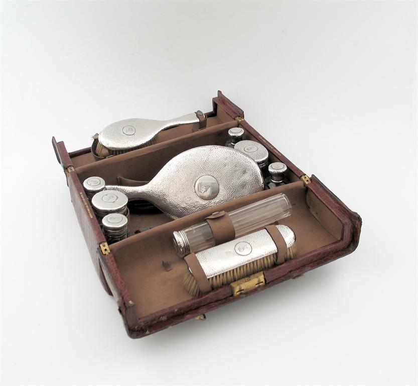 A modern 'Gladstone' type crocodile dressing case, fitted with the following (each with a hammered finish), seven mounted glass bottles and jars, two brushes and a mirror, all by J.C.Vickery, London 1911, crested, the case 13in (33cm) long.