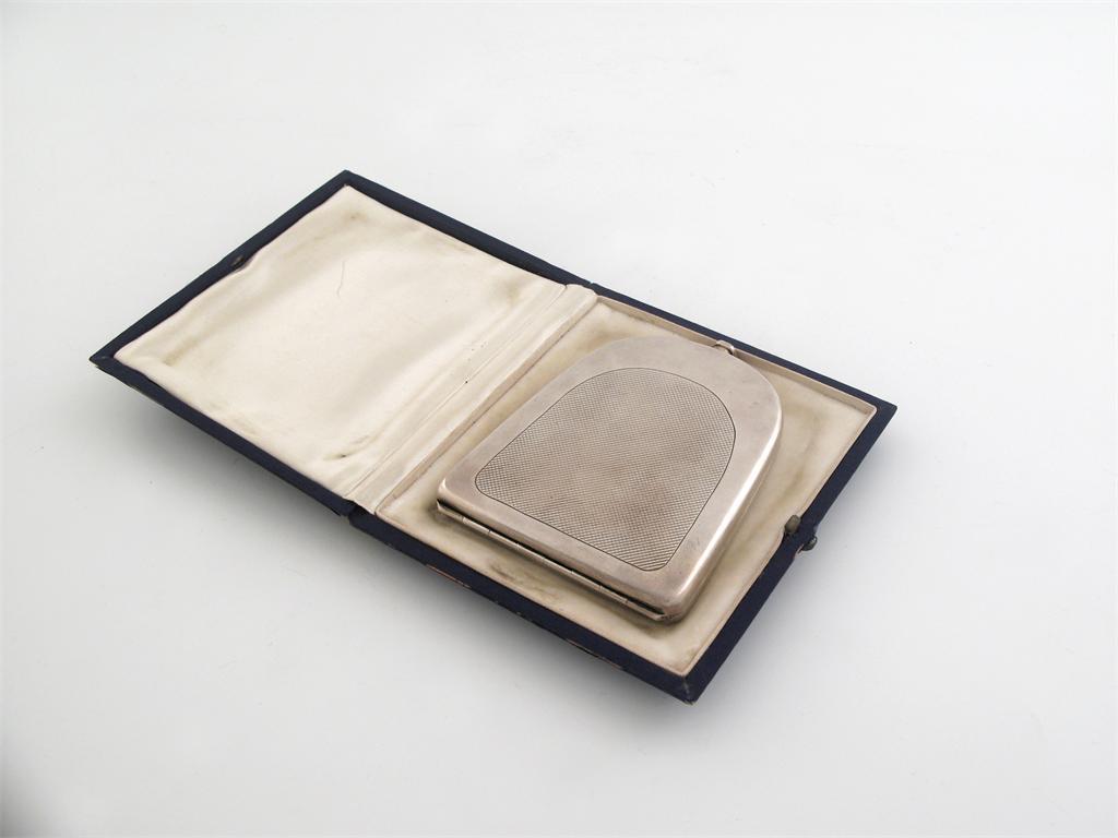 A modern novelty cigarette case in the form of a car radiator, the thumb press in the form of the radiator cap, by Charles Duminel, London 1921 (cased) 4.1in (10.5cm) high, 3.5oz