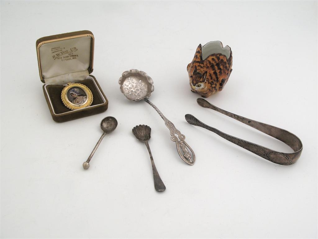 A mixed lot: a pair of George III bright cut sugar tongs, with leaf bowls, initialled 'H' over 'IM', makers mark distorted, London 1775, together with a George II salt shovel, a Victorian sugar sifter ladle, with figure terminal, a Victorian salt spoon, a gilt metal brooch inset with a miniature portrait, and a continental porcelain small pot, double sided in the form of a flustered owl. (6)