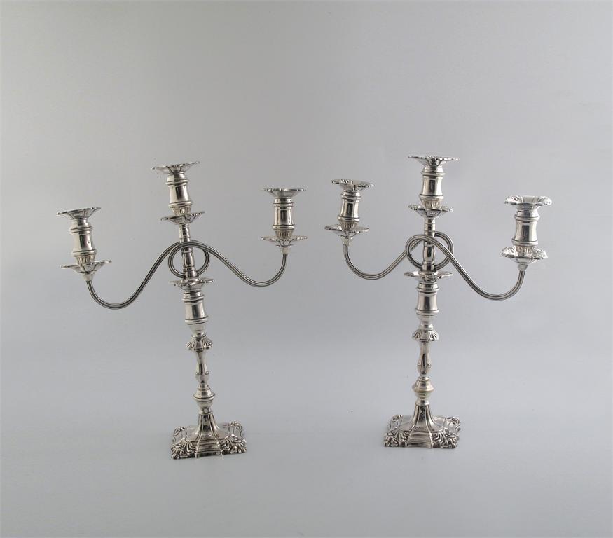 A pair of modern three-light candelabra with reeded branches, shaped square bases and shell decoration at the corners, 1(A/F) maker's mark "AT & SON" London 1957. 16in (41cm) high. 68oz.