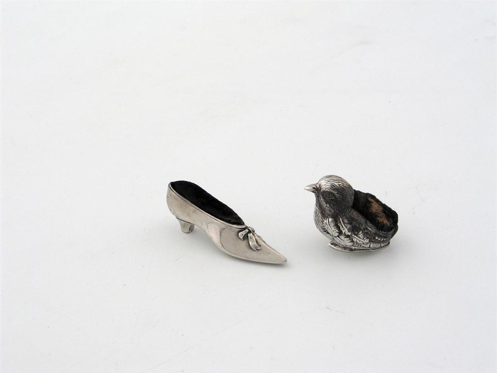 Two pin cushions: an Edwardian slipper, by Levi & Salaman, Birmingham 1907, 2.25in (5.7cm) long and a seated chick, by Levi & Salaman, Birmingham 1921, 1.25in (3.1cm) high. (2)
