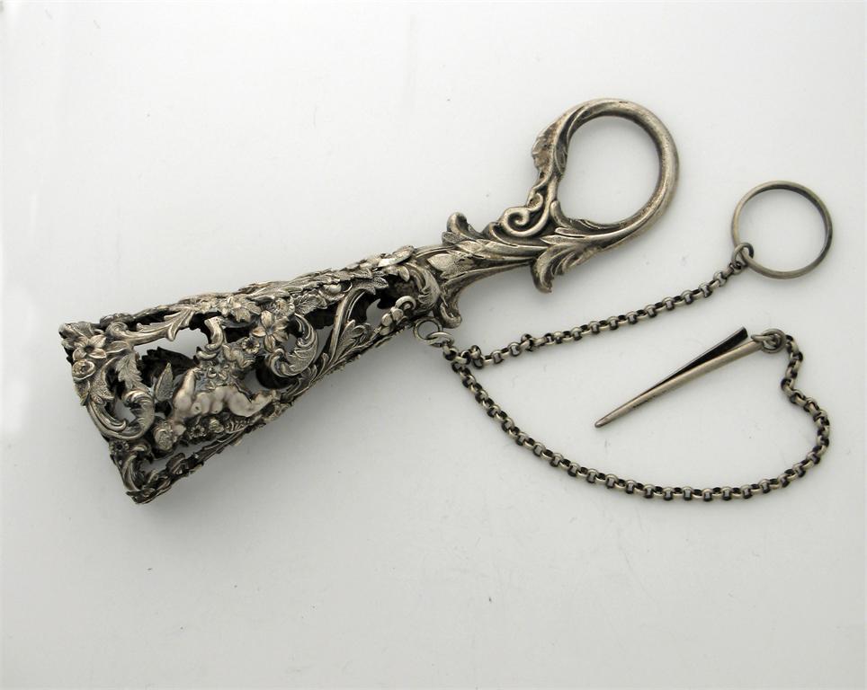 A Victorian plated posy holder, small handle, pieced with putti amongst floral scrolls, unmarked c.1860 5.5in. (14cm) long.