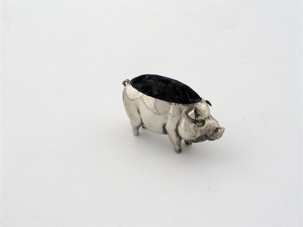 A standing pig, by Henry Matthews, Birmingham 1912, retailers mark for Allen Vancouver, 3in (7.6cm) long.