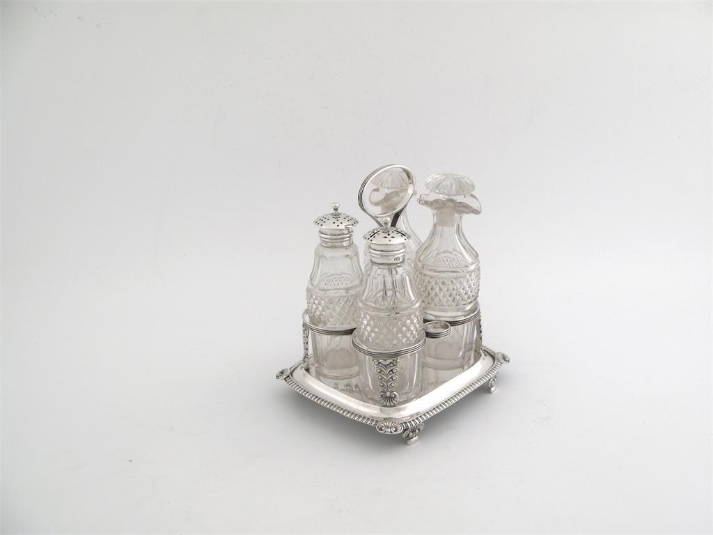 A George III 'soy' frame, with a gadrooned oblong base, shell corner and feet and a reeded loop handle, maker possibly S. Adams, London 1819 - fitted with four George IV cut glass bottles (two with mounts), 7.5in (19cm) high, 11oz weighable silver.
