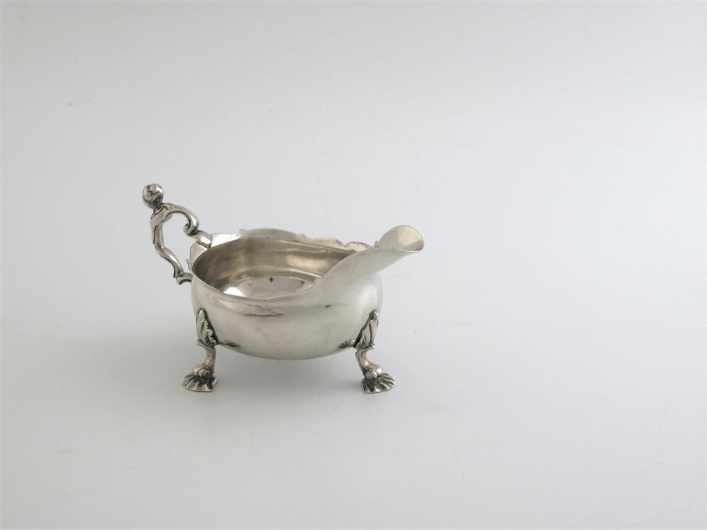 A George II cream boat with fret edge, the double scroll handle mounted with a female head, on three scallop feet, by Robert Innes, London 1743, 5.5in (14cm) overall length, 4.7oz