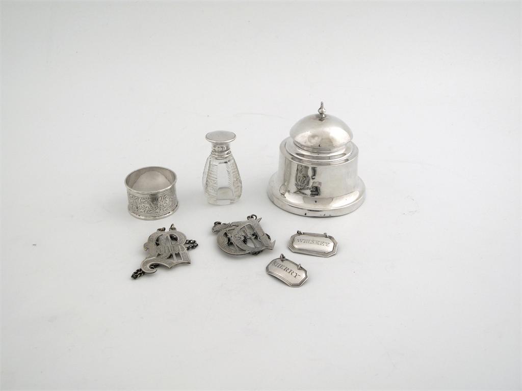 An inkwell, a napkin ring, a mounted bottle and four plated wine labels.