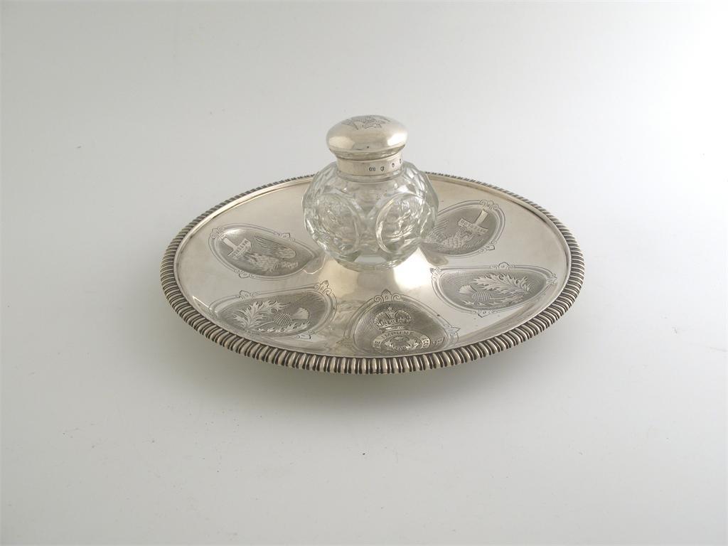 Regimental interest: An Edwardian Scottish inkstand, the gadrooned circular base 'dished' and engraved with badge of the the Royal Scots Greys, their battle honour 'WATERLOO' and thistles in dished oval reserves, mounted cut glass central ink bottle, by Hamilton and Inches, Edinburgh 1906, 11.6in (29.5cm) diameter, 29oz weighable silver.