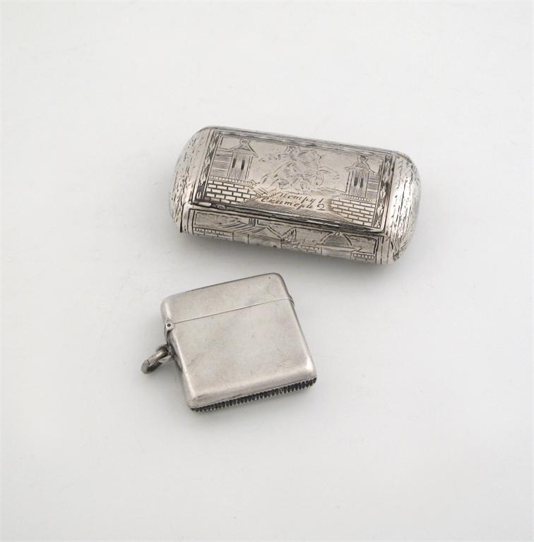 A Russian niellowork snuff box, of rounded oblong form with a concealed hinge, unknown maker (assay master Nikolay Dubrovin), Moscow 1829 and a late Victorian vesta case, the box 3.1in (8cm) long, 3.5oz. (2)