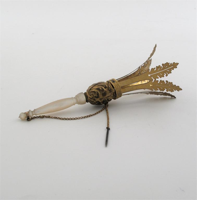 A 19th century Continental gilt metal posy holder with turned mother of pearl handle