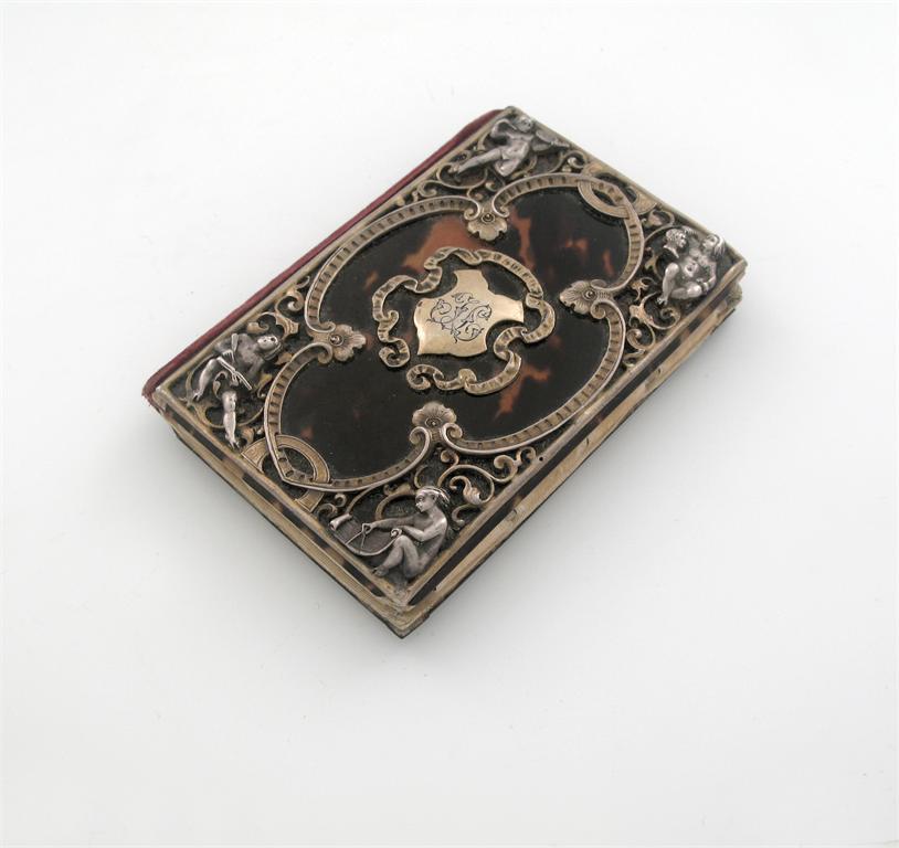 A 19th century French parcel gilt-mounted tortoiseshell aide memoire, with pencil and initialled, with putt, representing the arts circa 1870, 3.75in (9.5cm)